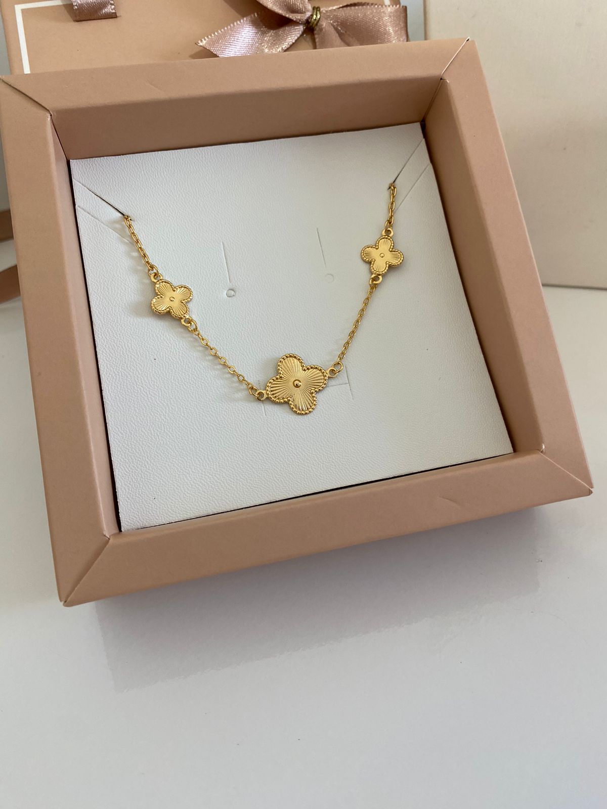 GARGANTILHA ELO ALONGADO COM TRES TREVOS DOURADOS COM CORRENTE DE 45CM + EXTENSOR.PEÇA DOURADA BANHADA A OURO 18K COM BANHO PRÓPRIO E GARANTIA DE 01 ANO.