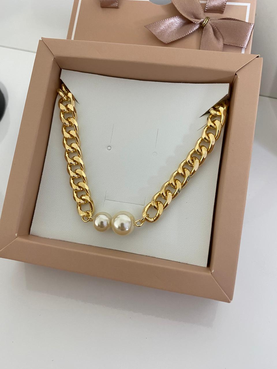 COLAR ELOS DE 10MM E COM 2 PEROLAS CORRENTE DE 30CM + 10CM DE EXTENSOR. PEÇA DOURADA BANHADA A OURO 18K COM BANHO PRÓPRIO E GARANTIA DE 01 ANO.