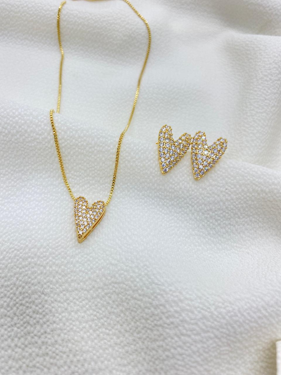 CONJUNTO GARGANTILHA DE 45CM COM PINGENTE E BRINCO CORAÇÃO CRAVEJADO EM MICRO ZIRCONIAS CRISTAL, SEMIJOIA ROMANTICA E CHEIA DE ELEGANCIA E BRILHO EM UMA UNICA COMPOSIÇÃO.