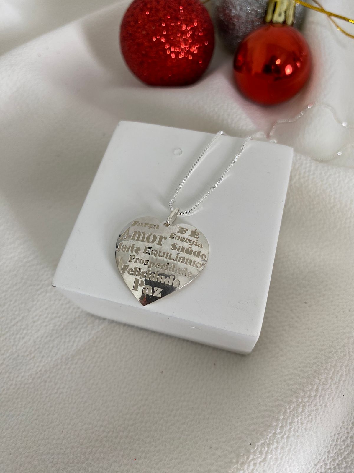 COM PINGENTE EM PRATA 925 , FORMATO CORAÇÃO ESCRITO "AMOR, FORÇA,FÉ,ENERGIA,SAUDE,SORTE, EQUILIBRIO,PROSPERIDADE,SAUDE E PAZ."