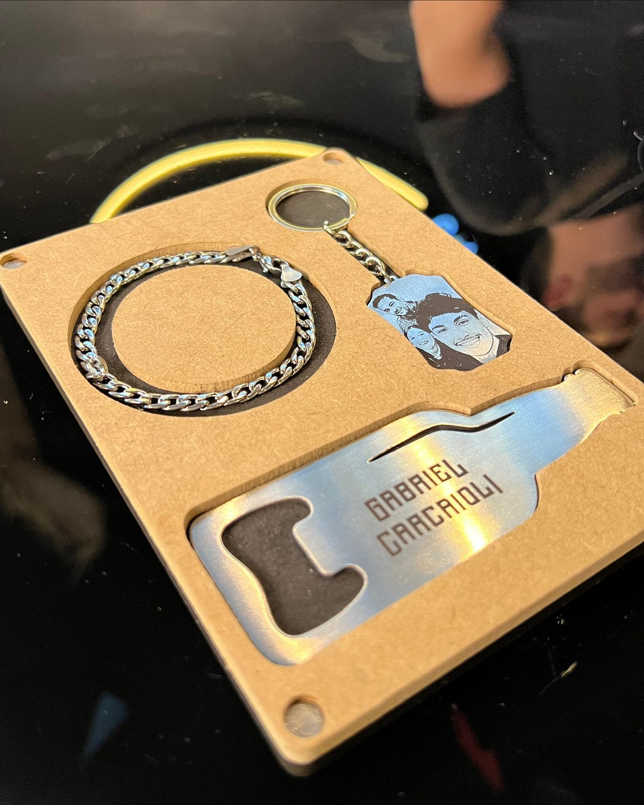COM UMA EMBALAGEM MODERNA QUE CONTEM, PULSEIRA, ABRIDOR PERSONALIZADO E UM CHAVEIRO COM FOTOGRAVAÇÃO NA FRENTE E VERSO.