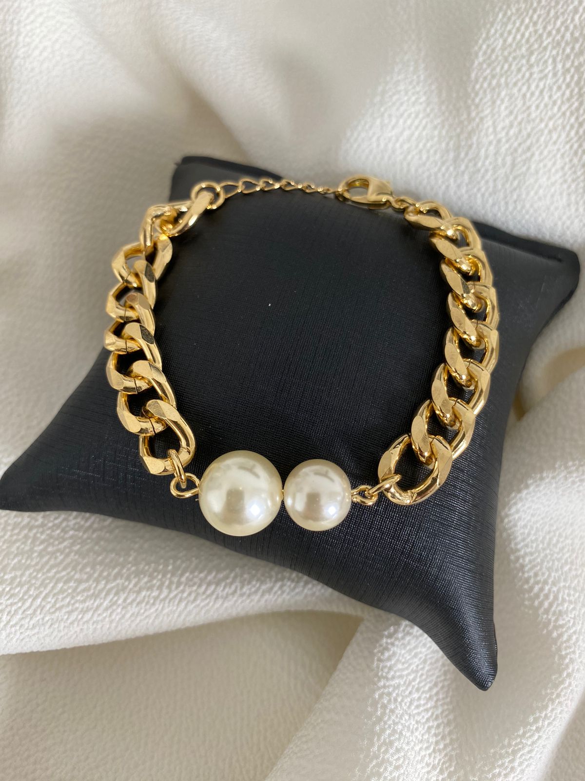 A pulseira Biamore com design moderno traz duas pérolas Shell destacadas em uma elos dourados elegantes. Esta semijoia combina com variados estilos, perfeita para quem busca sofisticação com toque sutil. Produzida em metal com banho dourado de alta resistência, oferece durabilidade e brilho prolongado. As duas pérolas Shell conferem um charme natural e delicado, ideal para complementar looks do dia a dia ou eventos especiais.